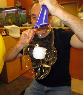 The kids continued to be astounded by the bubble antics! Fog-filled bubbles popped like magic in their hands and bounced lightly atop a bubble trampoline. Thank you again, Glenn, for another fantastic afternoon of science discovery - and for sharing your bubble recipes with us! I'm not sure how you'll top this one! ;)